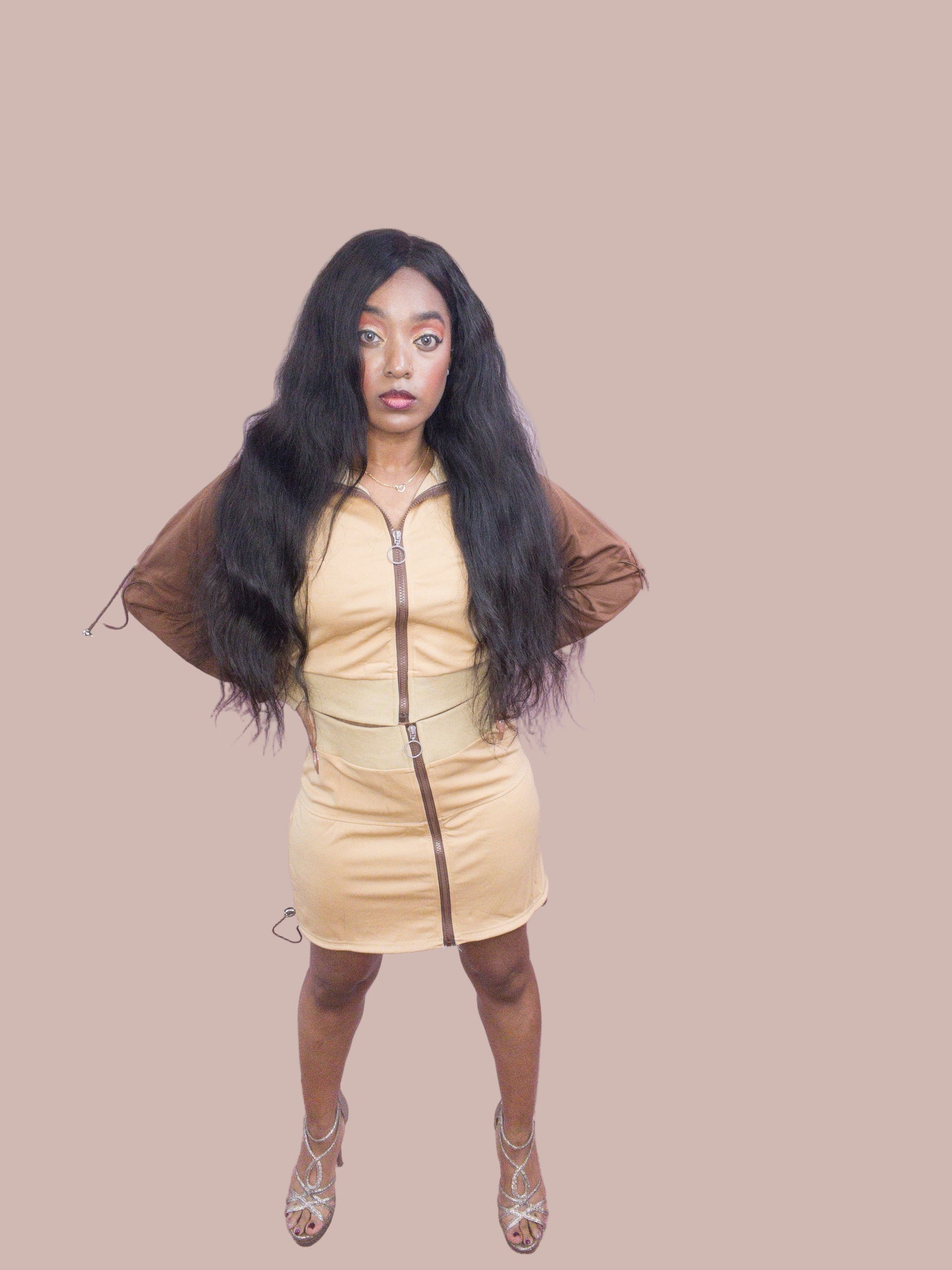 Brown & Khaki Zip Up Collar Jacket With Matching Skirt